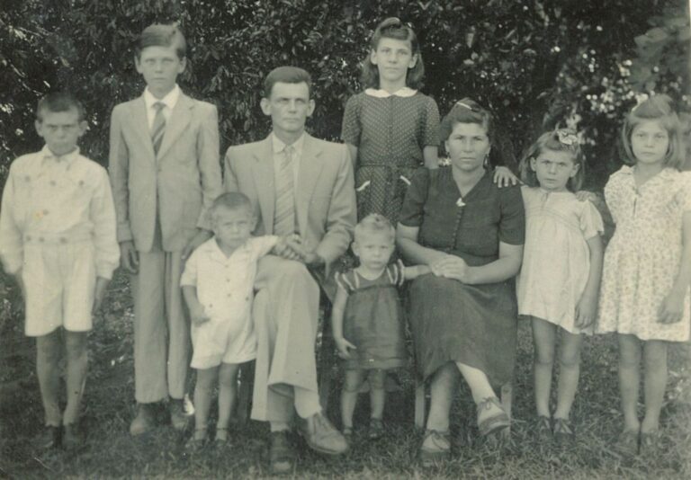 Angelo Benedet e Maria Macam Benedet Miro, Nair, Pedro, Ilza, Ermelinda, Abelo, Otília, Odete, Santina, Jorge. Data da foto: 1956Coleção: Jorge Benedet.